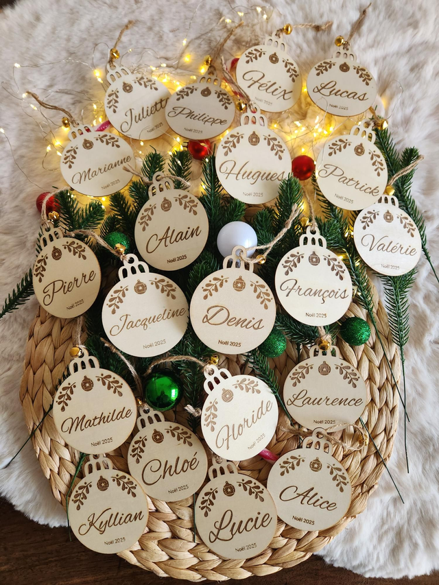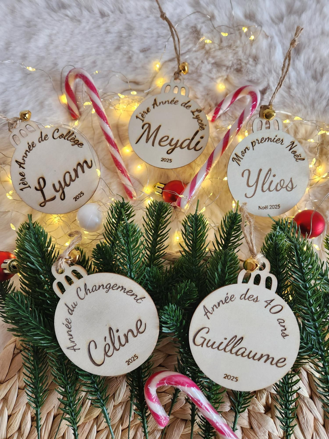 5 Boules de Noël en bois personnalisées, diamètre 7cm. Petite clochette et fil pour accrocher dans le sapin.