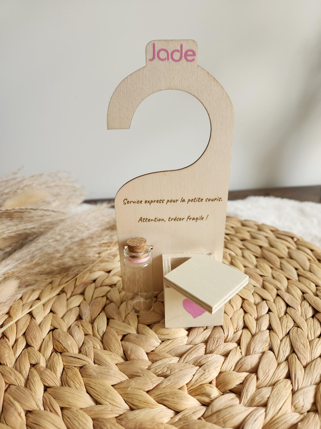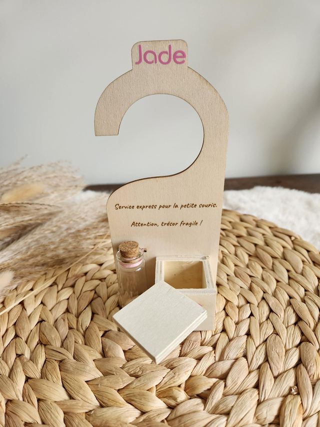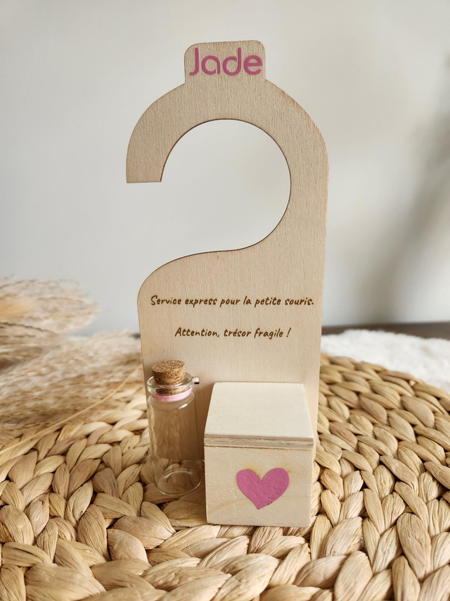 Pancarte de poignée de porte pour la petite souris. Fiole en verre pour la dent, petite boîte en bois pour déposer la pièce.